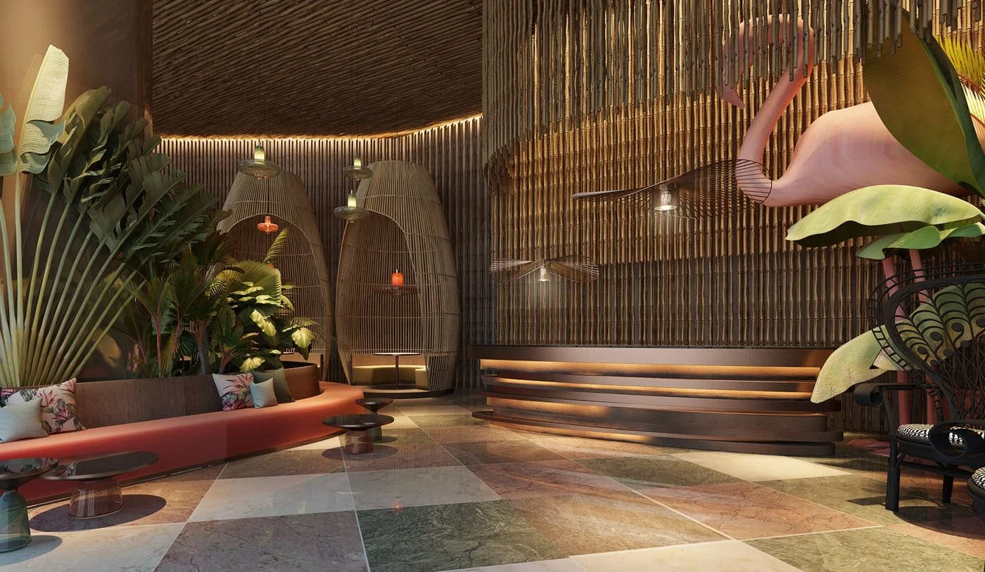 Tropical interior space with a series of unique, vibrant, and creative elements. For those staying in this beautiful space, it is a true interior getaway from the everyday hectic life.