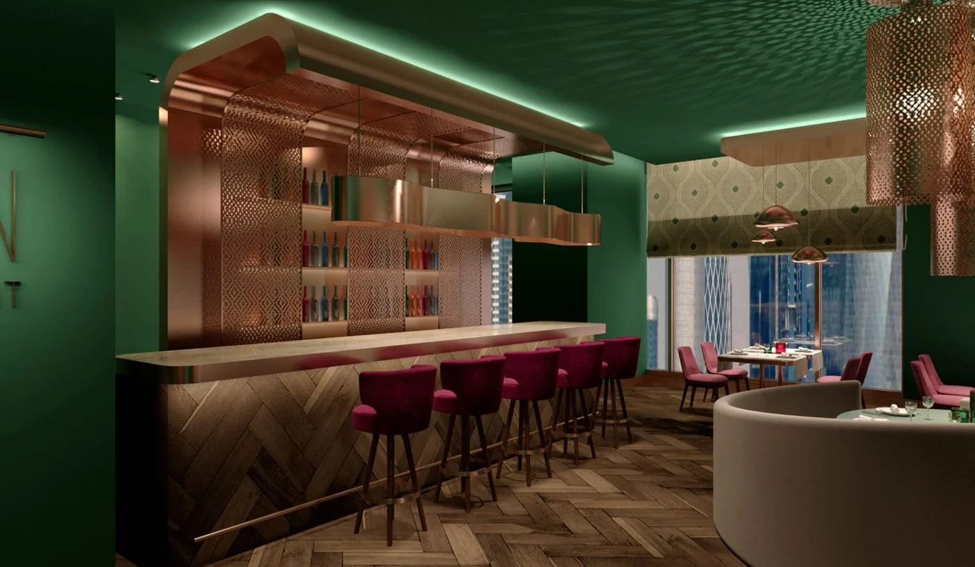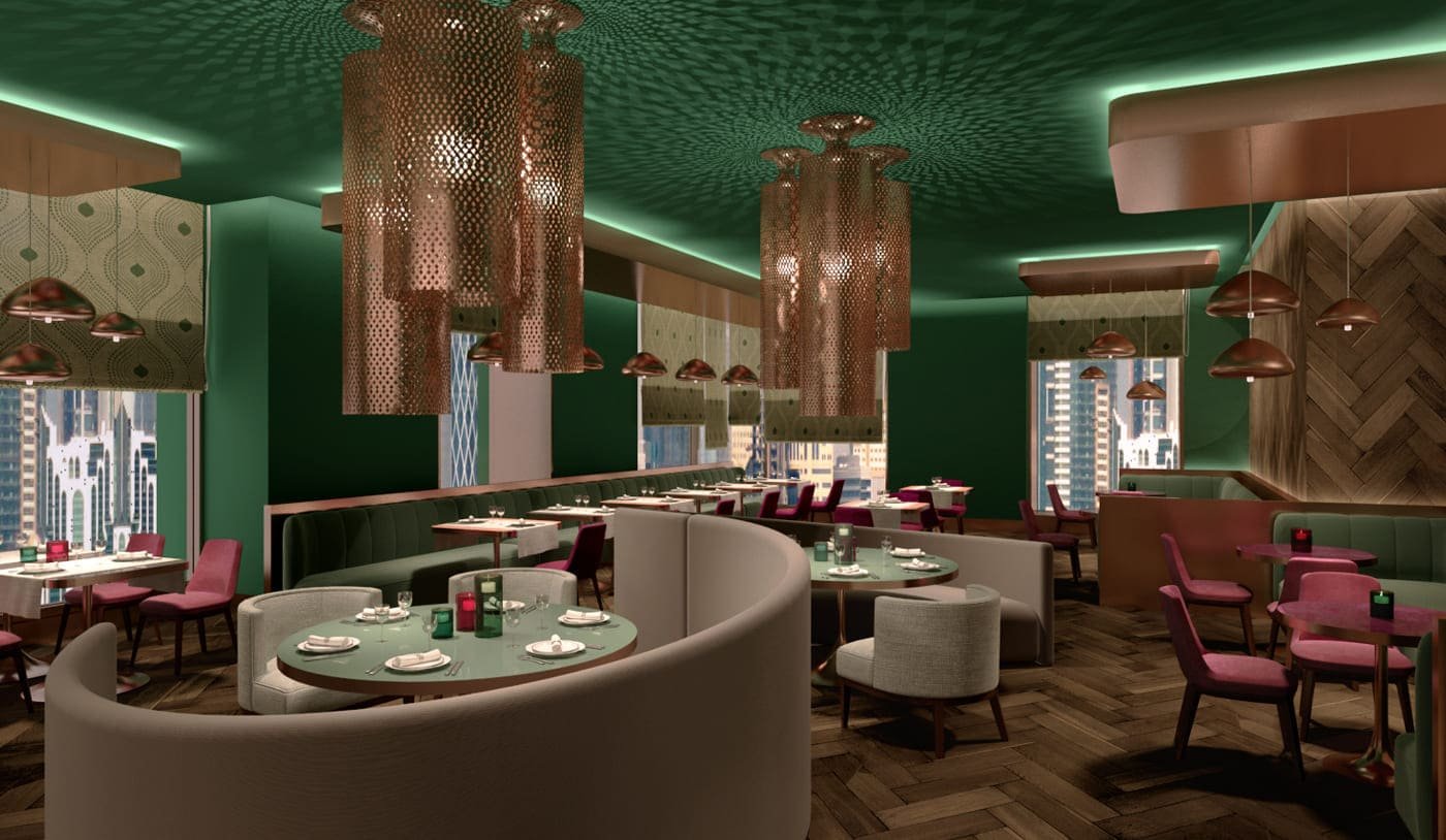 The fusion of the designed pieces of furniture and the traditional fabrics achieves a perfect balance between the traditional cuisine and contemporary interior design.