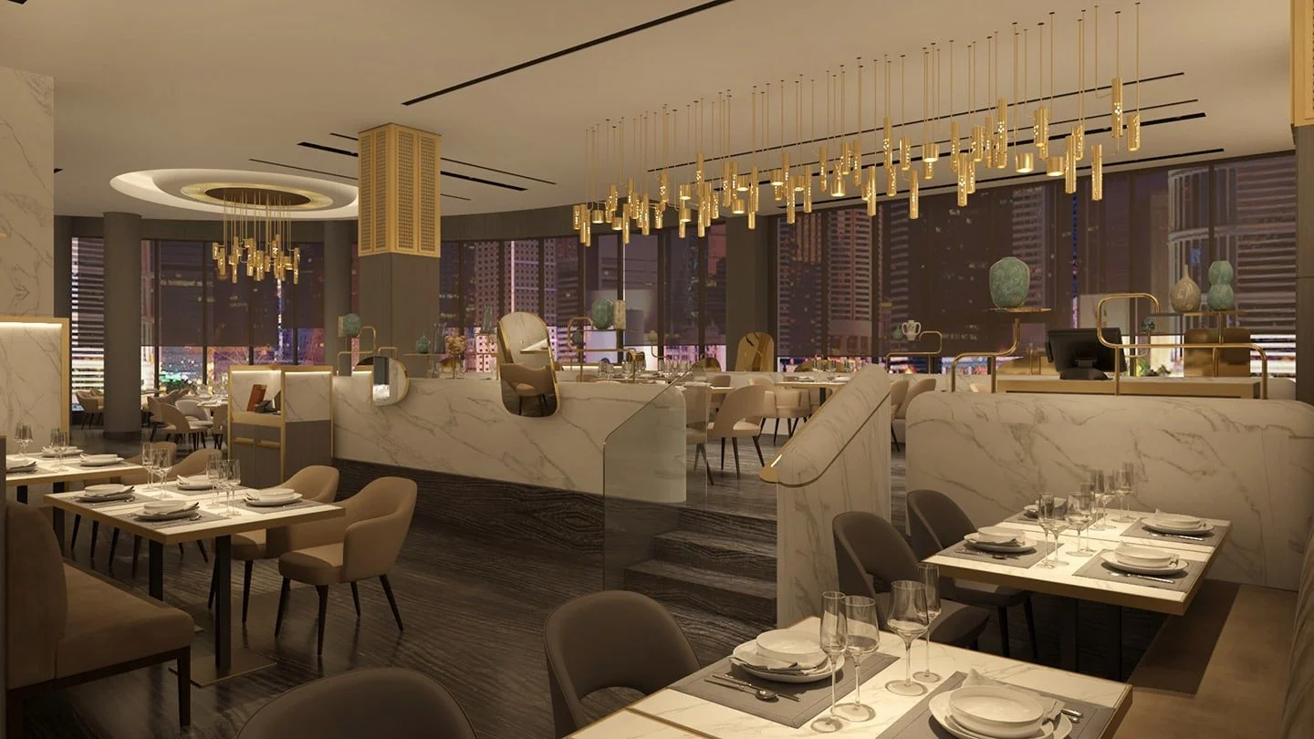 Seray was given a distinctly individual and bold design treatment — white marble, wood floor, elegant mirrors, and gold details were amongst the many special features used to create a sophisticated space within one of Mirabello’s hotel and apartment tower projects.